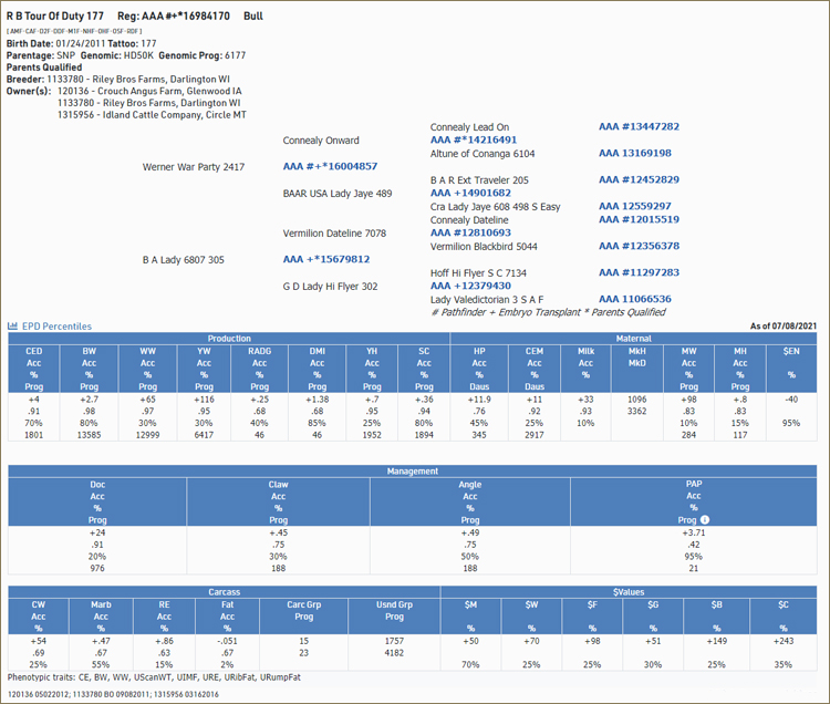 Being from this stud line, our bull sires healthy, quality calves. Below are the EPD Details of RB Tour of Duty 177:
